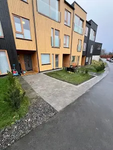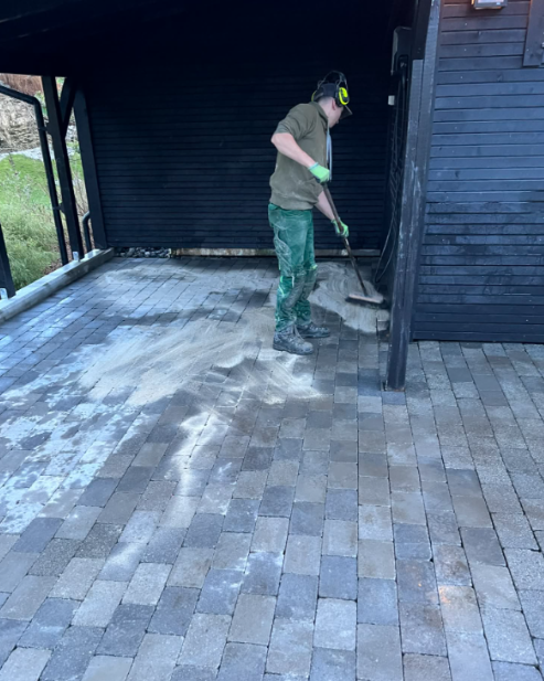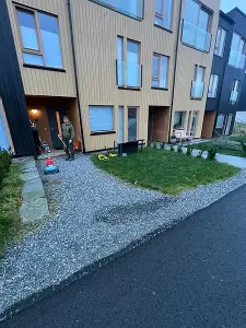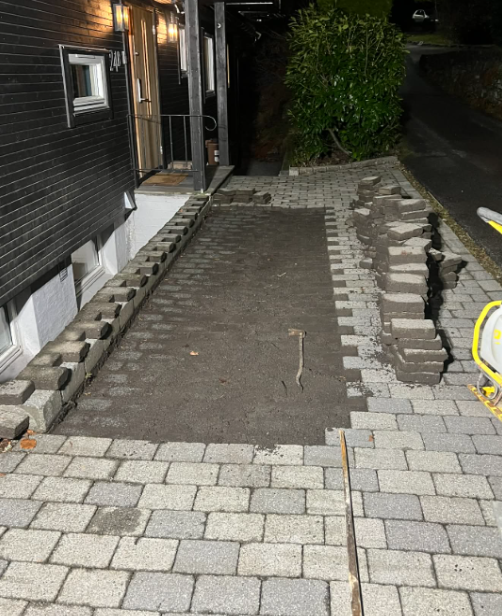 I dette prosjektet justerte vi helningen på området for å sikre riktig avrenning. Deretter la vi tilbake eksisterende belegningsstein både i ikkjørselen og i carporten. Arbeidet inkluderte også montering av sandfang for å håndtere overvann på en ekkektiv måte.